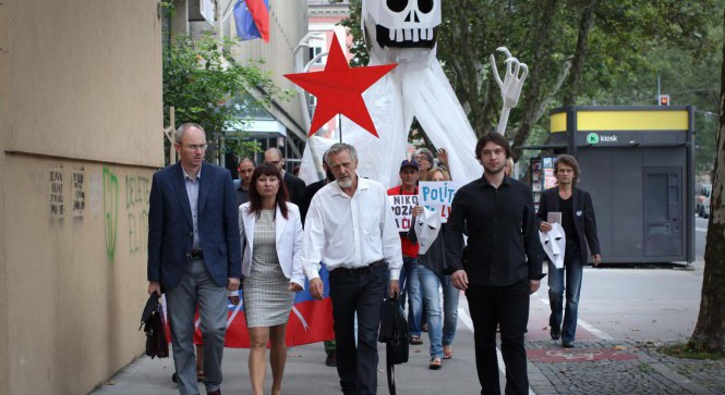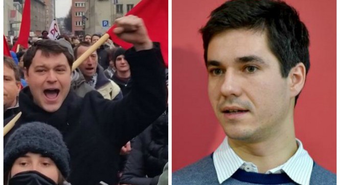 Poslanec Miha Kordiš (na sliki obkrožen) pri sodelovanju na protestih proti Janševi vladi